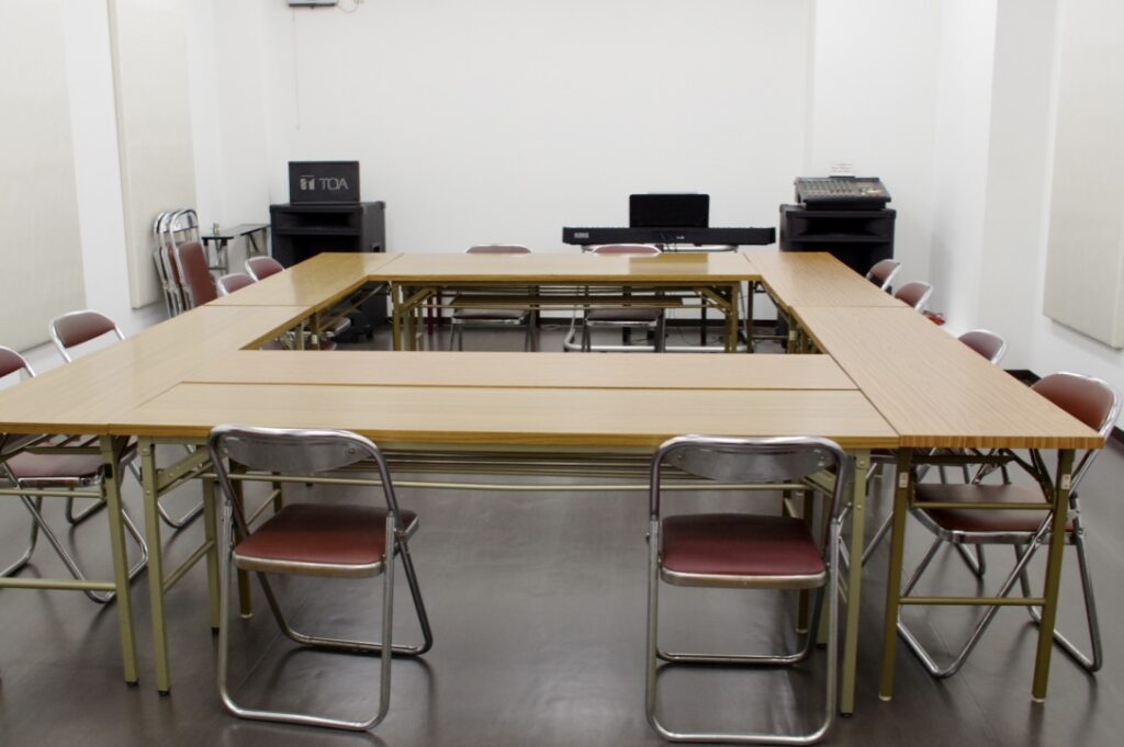| Aルーム | テーブル×8、イス×20、ホワイトボード(1200mm×900mm)、マイク(要申請)、10chミキサー、パワーアンプ、スピーカー、ピアノ椅子(YAMAHA No.5)、88鍵デジタルピアノ(KORG)、譜面台、ギターアンプ、Wi-Fi |